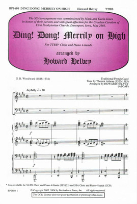 Ding! Dong! Merrily on High joins the distinctive list of Mr. Helvey's superb carol arrangements with 4-hand accompaniment. This latest addition literally sparkles with joy. By constantly varying harmonization, pianistic texture and part writing, he takes a well-known Christmas carol and helps us hear it as never before. Don't deny two capable pianists this much fun. They'll thank you for it! The same arrangementfor SATB voices (BP1653) is available.